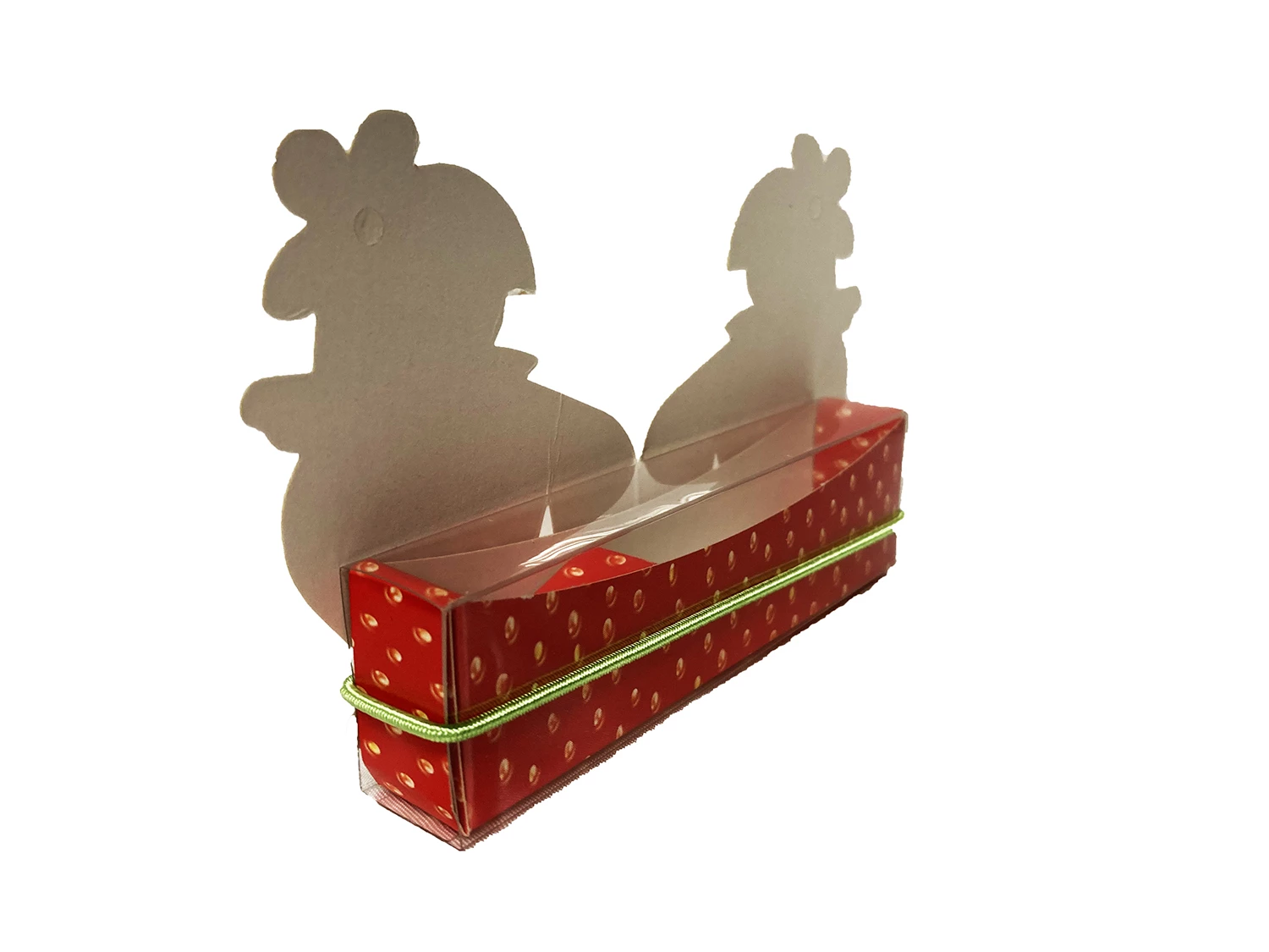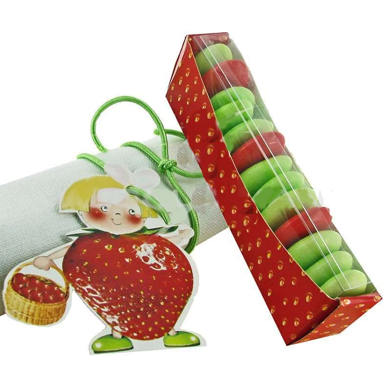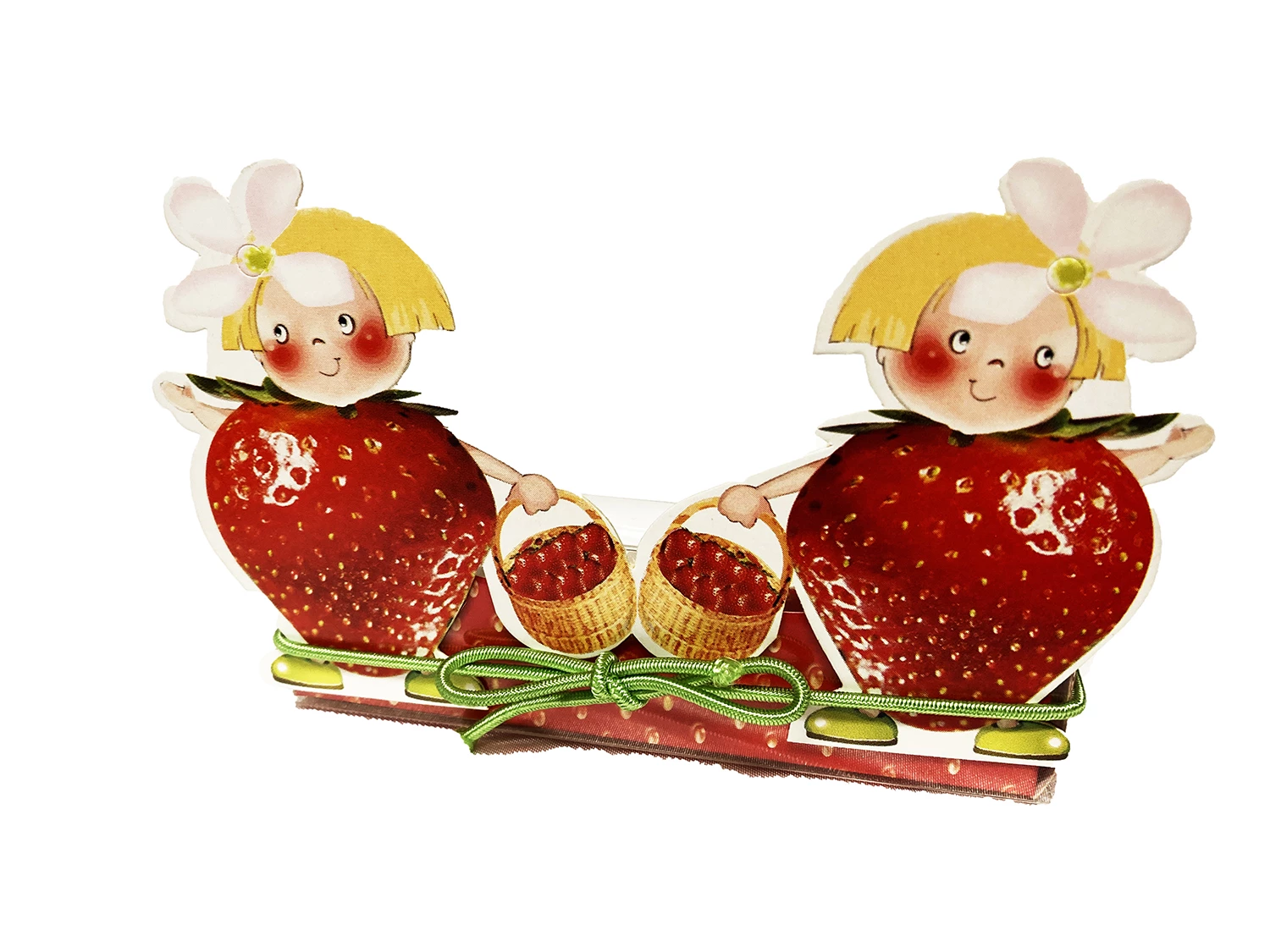 Lot de 5 ballotins composés d’une barquette cartonnée imprimée fraise et de son couvercle transparent, d’une double étiquette rigide fillette/fraise et d’un lien élastique de couleur vert pouvant servir de marque place ou rond de serviettes