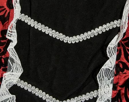 Déguisement de marquise composé d’une robe en tissu broché rouge et noir , satin et ornée de dentelles blanches et galons argent .