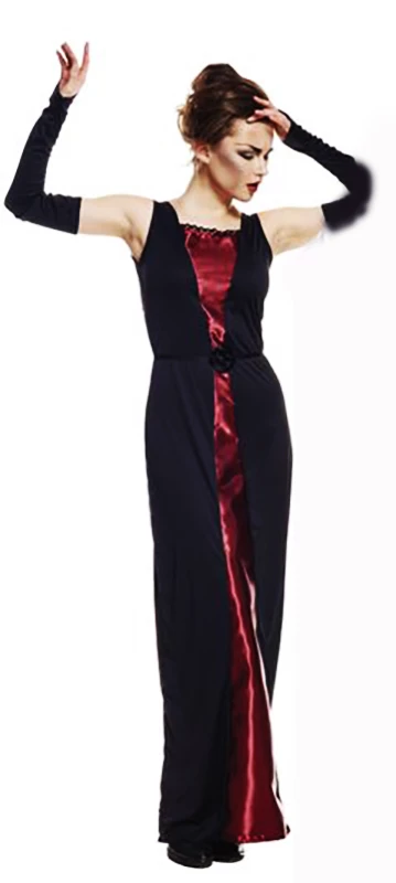 Ce costume original et élégant est composé d’une robe longue sans manche en jersey noir et satin bordeau .et une paire de mitaines noires .